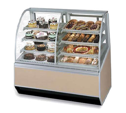 Series ’90 Dual Bakery Case Refrigerated Left Non-Refrigerated Right, 59-1/4"W x 37-3/4"D x 48-1/2”H, self contained refrigeration with condensate evaporator, adjustable temperature control, tempered curved lift-up front glass, top light & shelf lights, (3) tiers of adjustable white wire shelves, white interior, removable glass sliding rear doors sloped for easy product access, tempered glass ends, choice of laminate & trim, 1/3 HP, cULus, UL EPH Classified, Made In USA, DOE 2017 compliant