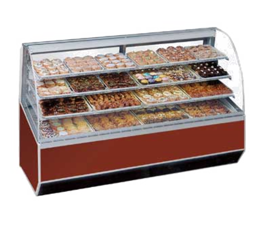 Series ’90 Non-Refrigerated Bakery Case, 77-1/4"W x 37-3/4"D x 48-1/2”H, tempered curved lift-up front glass, top light & shelf lights, heat reducing vent system, (3) tiers of adjustable white wire shelves, white interior, removable glass sliding rear doors sloped for easy product access, tempered glass ends, choice of laminate & trim, cULus, UL EPH Classified, Made In USA, DOE 2017 compliant