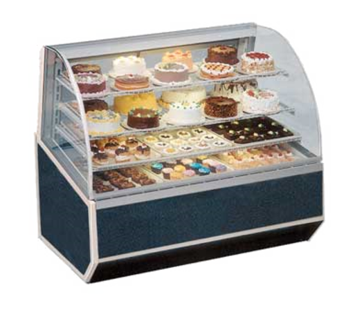 Series ’90 Refrigerated Bakery Case, 48-1/4"W x 37-3/4"D x 48-1/2”H, self contained refrigeration with condensate evaporator, adjustable temperature control, tempered curved lift-up front glass, top light & shelf lights, (3) tiers of adjustable white wire shelves, white interior, removable glass sliding rear doors sloped for easy product access, tempered glass ends, choice of laminate & trim, cULus, UL EPH Classified, Made In USA, DOE 2017 compliant