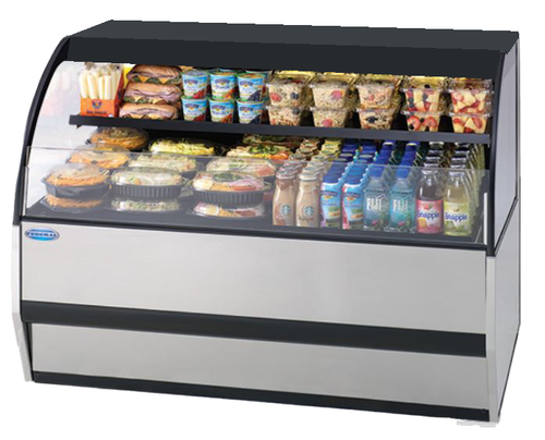 Specialty Display Versatile Service Top over Refrigerated Self-Serve Counter Case, 50"W x 34"D x 32-5/8”H, self contained refrigeration with PTC condensate evaporator, adjustable temperature control, 3500K LED horizontal top light, stainless steel top, black display deck & step riser, black interior, black trim, tempered glass ends, rear condensing unit air intake & discharge, choice of laminate, 1/3 HP, cULus, UL EPH Classified, Made In USA, DOE 2017 compliant
