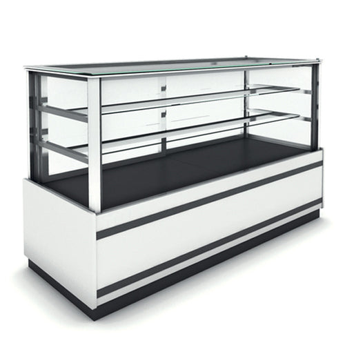 AP Series Refrigerated Bakery/ Pastry/ Dessert/ Chocolate/ Deli Display Case/Showcase, 80.31"W, (2) tiers of shelving + deck, fixed straight front glass, sliding glass rear doors, LED lighting, casters, self-contained refrigeration, 220v/60/1-ph, 16.0 amps, CE, ETL, ETL-Sanitation