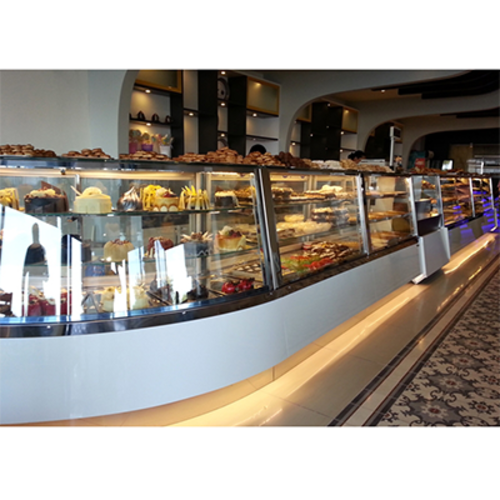 AP-Conic Curved Refrigerated Bakery/ Pastry/ Dessert/ Chocolate/ Deli Display Case/Showcase, 97"W on customer side, 53.3"W on service side, 90° open angle, side mount self-contained refrigeration, fixed curved front glass, (3) tiers of shelving + deck, sliding glass back doors, 220v/60/1-ph, 15.0 amps, CE, ETL, ETL-Sanitation