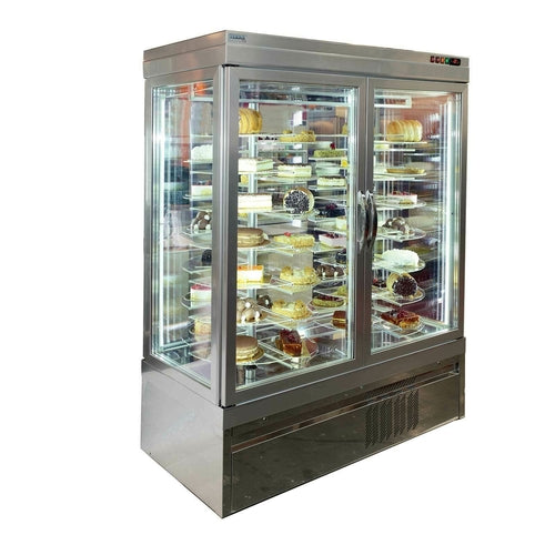 Lexus Series Classic Refrigerated Display Case/Showcase, two-section, 59"W, 26 revolving shelves per section, (4) glass sides, +50°F/+23°F temperature range, electronic temperature controls, silver finish, bottom mount self-contained, 220v/60/1-ph, 10.0 amps