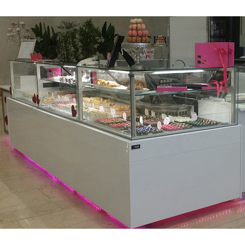 Kubo Refrigerated Bakery/ Pastry/ Dessert/ Deli Display Case/Showcase, 35.8"W, (1) intermediate shelf + deck, without under storage, straight front glass, self-contained refrigeration, rear sliding doors, 220v/60/1-ph, 5.0 amps, CE, ETL, ETL-Sanitation