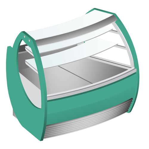 MTX-Series Curved Refrigerated Bakery/ Pastry/ Dessert/ Chocolate/ Deli Display Case/Showcase, 63"W on customer side, 38" on service side, 30° open angle, (2) intermediate shelves + deck, hydraulic front glass opening, sliding rear doors, curved-tempered double pane heated glass, casters, 220v/60/1-ph, 5.0 amps, CE, ETL, ETL-Sanitation