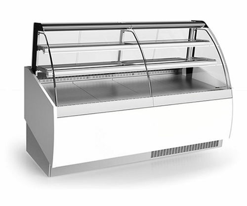 Passion Refrigerated Display Case/Showcase for Pastries and Desserts, 112.6"W, deck only, (2) shelves, curved front glass, self-contained refrigeration, 220v/60/1/ph, 10.0 amps, CE, ETL