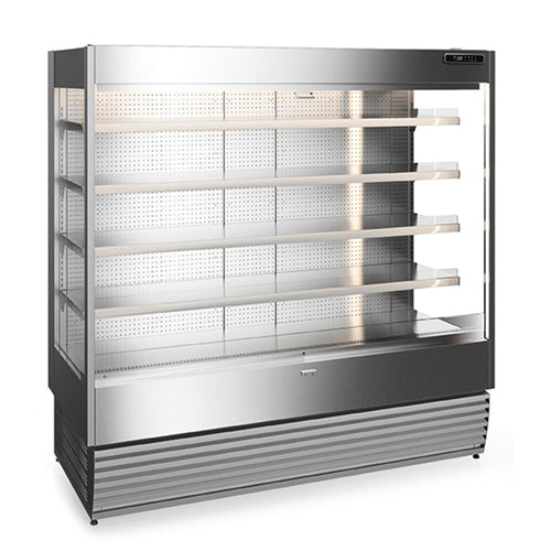 United Refrigerated Pass-Through Open Merchandiser, 63"W, 75"H, self-contained refrigeration, (4) tiers of shelving, electronic digital control, LED interior lighting, night blind, transparent side panels, stainless steel exterior, casters, 115v/60/1-ph, 16.0 amps, ETL, ETL-Sanitation, CE