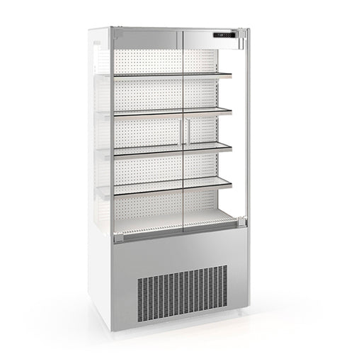 United Slim Refrigerator Merchandiser, two-section, 50"W, 75"H, bottom mount self-contained refrigeration, (4) tiers of shelving, (2) hinged glass doors, electronic digital control, LED interior lighting, night blind, transparent side panels, stainless steel exterior, casters, 115v/60/1-ph, 18.0 amps, ETL, ETL-Sanitation, CE