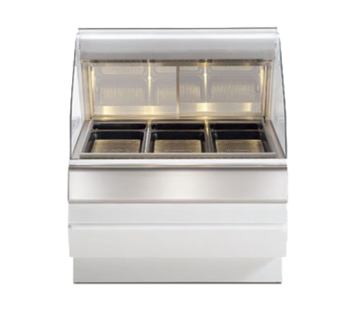 HMR-103 Heated Merchandiser, 3 full-service wells with 2 long and 6 cross adjustable pan supports (each well holds 1 full & 1 third-size pan or equivalent combinations of other sizes), THERMA-VEC® Even Heat Process, lockable electronic controls for radiant heat above each well, lower heat, and water pan heat, 1 food temperature probe and 3 receptacles, halogen lamps, removable sliding rear doors, plastic cutting board, cULus, UL EPH, CE