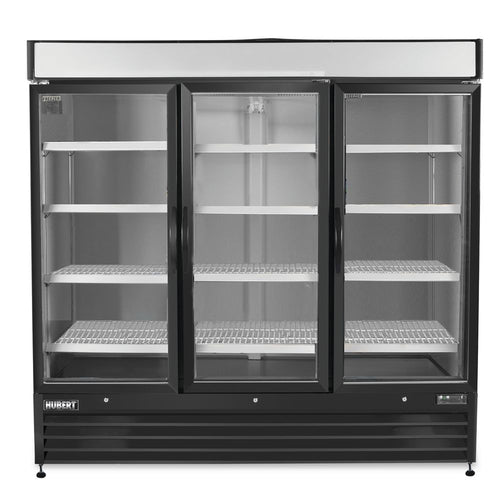 Freezer Merchandiser, 3-section, 72 cu. ft., 81"W x 31-15/16"D x 79-1/2"H, (3) self-closing triple pane hinged glass doors, magnetic gasket, (12) adjustable shelves, LED interior lighting & temperature display, electronic thermostat, temperature range: -10° to 10°F, bottom mount self-contained refrigeration system, leveling feet with rollers, white coated steel interior, black coated steel exterior, 1-1/4 HP, 115/208-230v/60/1-ph, 8 amp, NEMA L14-20P, cULus, UL EPH
