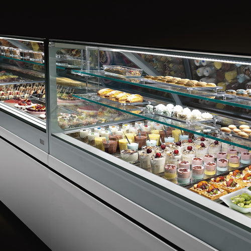 SAM80 Professional Pastry Display Case, 64-21/100"W, straight high glass, (2) adjustable shelves, Operating temperature: 39.2°F/46.4°F, hermetic sliding doors (HCS) with chrome-plated handles, LED top lighting, ventilated refrigeration, condenser unit with two fans, water evaporation tank with electrical resistor, side panels and plinth in grey lacquered sheet metal (RAL 9018 matt), front panel in white melamine, CE