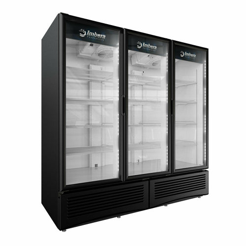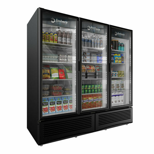 (1013936) Refrigerated Merchandiser, three-section, (15) flat shelves, black painted steel exterior, white interior, (3) hinged glass door, LED interior lighting, electronic temperature controller & fan motors, bottom mounted self-contained refrigeration, 1/3 HP, 115v/60/1-ph, 13.8 amps, cULus, NSF, UL EPH Classified