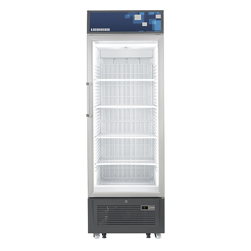 Refrigerator Merchandiser, reach-in, one-section, 26-7/16"W, bottom mount self-contained refrigeration, 16.3 cu. ft. capacity, (1) right hinged glass door (locking), (4) adjustable plastic coated shelves, electronic controls, digital temperature display, auto defrost, LED interior lighting, plastic white interior, white steel exterior, R290 Hydrocarbon refrigerant, casters, 115v/60/1-ph, 5.0 amps, NSF, cULus