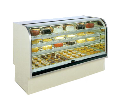 Heated Display Case, electric, 77" length, forced air, curved glass front, sliding rear doors, mirror finish stainless steel interior, aluminum deck, (3) 26" deep white wire shelves with lights