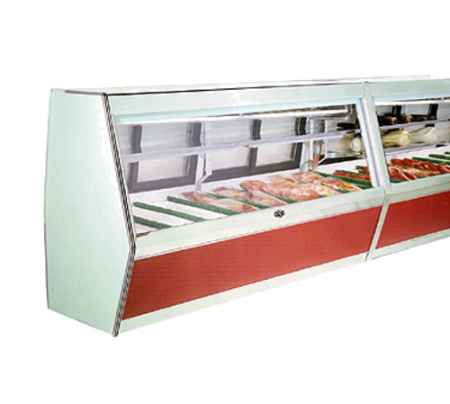 Double Duty Endless Meat Display, 70" L, triple pane display glass front, (2) sliding rear doors, deck, mezzanine shelf with fluorescent lights, white aluminum interior, mirror stainless steel trim, designed for remote refrigeration, 1/2hp, NSF