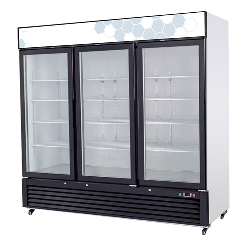 Competitor Series® Refrigerator Merchandiser, reach-in, three-section, 82" W, 72.0 cu. ft. capacity, bottom mount self-contained refrigeration system, (3) dual pane hinged glass doors (locking), (12) shelves, LED interior lighting, illuminated canopy, digital temperature controller/display (+33° to +41°F), forced air cooling, auto defrost, white powder coated steel exterior & interior, 3" casters, R290 Hydrocarbon refrigerant, 3/4 HP, 115v/60/1-ph, 10.2 amps, NEMA 5-15P, cETLus, ETL-Sanitation, Migali® Plant-A-Tree Pledge: Migali® pledges to plant a tree for every product sold in partnership with the Earth Day Network