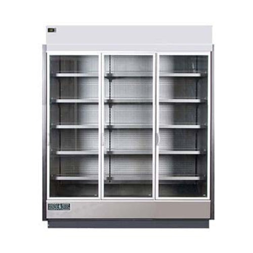 (SPECIAL ORDER) Hydra-Kool High Volume Refrigerated Merchandiser, reach-in, multiplexable, 75-3/8"W x 32-5/8"D x 87-7/8"H, 56.37 cu. ft., (3) hinged glass front doors, retractable night curtain, PVC coated gray steel interior with (5) adjustable shelves, 32°-40°F temperature range, digital controller, LED lighting in canopy & under each shelf, PVC coated silver steel front panel, gray kick plate, self-contained refrigeration, adjustable feet, 5/8 HP, ETL-Sanitation, cETLus