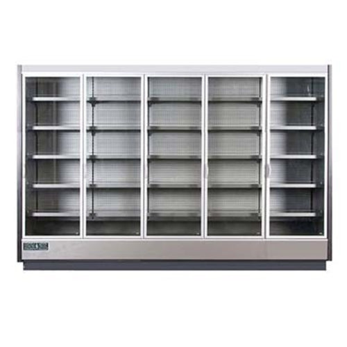 (SPECIAL ORDER) Hydra-Kool High Volume Refrigerated Merchandiser, reach-in, multiplexable, retractable night curtain, 123-3/8"W x 31-1/2"D x 77-3/4"H, (5) hinged glass front doors, (5) solid rear loading doors, PVC coated gray steel interior with (5) adjustable shelves, 32°-40°F temperature range, digital controller, LED lighting in canopy & under each shelf, PVC coated silver steel front panel, gray kick plate, designed for remote refrigeration, adjustable feet, ETL-Sanitation, cETLus