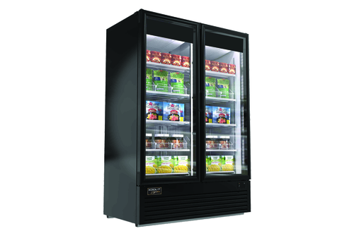 Kool-It Signature Merchandiser Freezer, two-sections, 42.97 cu-ft capacity, 54-3/10"W x 31-3/10"D x 78-9/10"H, (2) triple pane glass door hinged right, white pre-painted steel interior with (8) shelves & LED lighting, black pre-painted steel exterior, bottom mounted self-contained refrigeration, eco-friendly R290 refrigerant, 1/2 HP, 115v/60/1-ph, 11.2 amps, cord with NEMA 5-15P