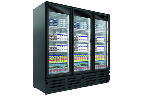 Kool-It Signature Merchandiser Refrigerator, 66.3 cu. ft., 78-3/4"W x 33-5/8"D x 79-3/8"H, (3) hinged locking glass door, 32° to 44-3/5°F temperature range, (15) shelves, interior LED lighting, black pre-painted steel exterior, eco-friendly R290 refrigerant, (2) 1/2 HP, 115v/60/1-ph, 8.7 amps, cord with NEMA 5-15P, NSF Certified, Energy Star