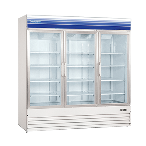 Reach-in Refrigerator, three-section, 53 cu. ft., (3) glass swing doors, digital temperature display, (12) adjustable shelves, interior LED lighting, heavy-duty caster wheels, white coated steel exterior, aluminum interior liner with steel floor, self-contained refrigeration, bottom mounted compressor, R290 refrigerant, 3/4 HP, 115v/60/1-ph, 10.7 amps, NEMA 5-20P, cETLus, ETL-Sanitation