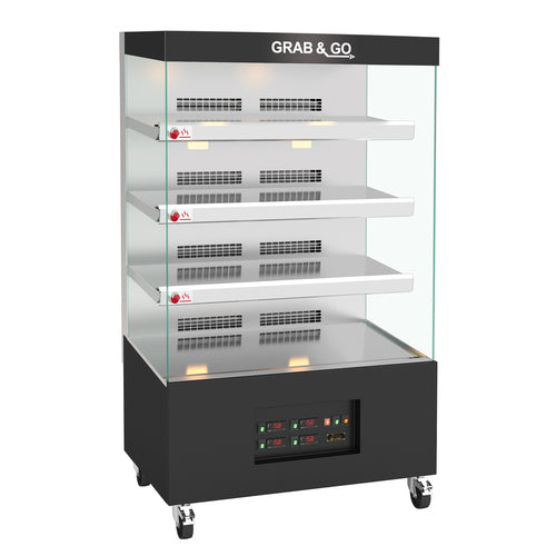 Essentiel Heated Display Merchandiser, 40-3/8"W, front-loading, 37-74 chickens in shells capacity, digital thermostat, radiant heat, 145° to 158°F temperature range, (4) shelves inclined at 5°, LED light per shelf, glass side panels, 'GRAB & GO' roof banner, stainless steel & black epoxy finish, 6.22kW, 208-240v/60/3-ph, 26.0 amps, cETLus, ETL-Sanitation