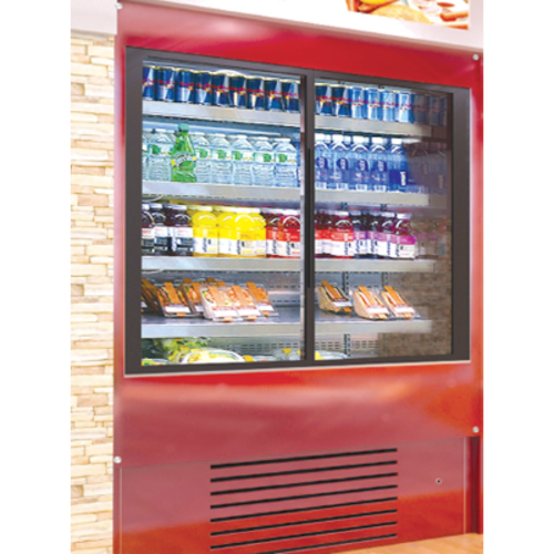 Olympus II Porte Cachee™ Air Screen Display Case, 48" W x 78" H, with (2) front sliding-hinged pocket doors, self-contained base mounted refrigeration, lift out black louvered air grill, electronic digital control, defrost termination, digital temperature display, square top canopy with LED light, (4) adjustable stainless steel shelves with LED lights, removable stainless steel deck, perforated back panel, brushed stainless steel interior ends, laminated exterior, floor drain required, 1 hp, cETLus, UL, ETL-Sanitation, NSF 7, NSF STD 7, DOE 2017 Compliant