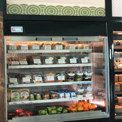 Olympus V Porte Cachee Market Express Open Merchandiser, 48"W x 31-7/8"D x 78-1/2"H, self-contained refrigeration, (2) front hinged pocket doors (locking), (4) adjustable stainless shelves with LED lights, Smart electronic control with digital temperature display, cleaning indicator lights, defrost termination, LED canopy light, removable deck pan, includes header bracket, built-in condensate evaporator, lift out black louvered air grill, solid end panels, stainless steel interior ends & back panel, laminate exterior, 1 HP, cETLus, ETL-Sanitation