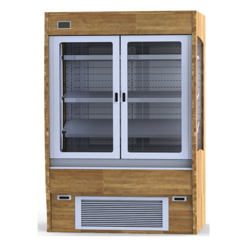 Olympus V Turbo Porte Cachee Air Screen Open Merchandiser, 48"W x 31-15/16"D x 78-1/2"H, self-contained refrigeration, (2) electro-magnetic lock front hinged pocket doors, (4) adjustable stainless shelves with LED lights, Smart Controller food product simulator probe & safety sensor, cleaning indicator lights, LED canopy light, motorized turbo curtain, removable deck pan, built-in condensate evaporator, lift out black louvered air grill, solid end panels, stainless steel interior ends & back panel, laminate exterior, 1 HP, cETLus, ETL-Sanitation