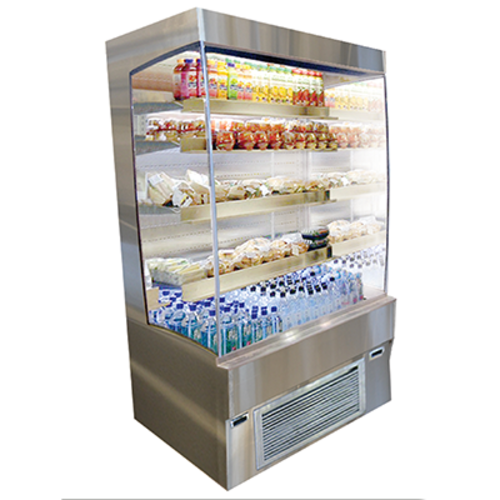 Olympus V Air Screen Open Merchandiser, 72"W x 31-3/4"D x 78-1/2"H, self-contained refrigeration, (4) adjustable slanted stainless shelves with LED lights, Smart electronic control with digital temperature display, cleaning indicator lights, defrost termination, LED canopy light, removable deck pan, built-in condensate evaporator, night curtain, lift out black louvered air grill, solid end panels, stainless steel interior ends & back panel, laminate exterior, 1-1/4 HP, cETLus, ETL-Sanitation