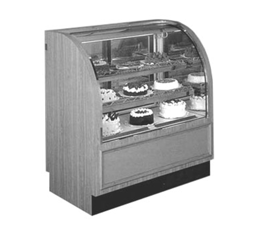 LaRond Refrigerated Bakery Case, 96" L, self-contained refrigeration, service type, fixed curved glass front, top canopy LED light, (3) glass shelves with LED lights, white deck, mirrored laminate interior ends with glass vision end panels, mirrored rear sliding doors, laminated exterior, black base, condensate evaporator, 1/2 hp, cETLus, ETL-Sanitation, NSF