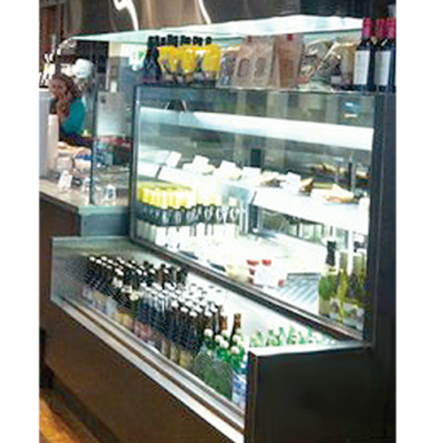 Monarch Bakery Specialty II Case, full service/self-service, 72"W, self-contained refrigeration, square profile, full service top section with insulated glass, clear rear sliding doors, (2) tempered glass shelves, LED lighting, removable hemmed deck pan, grab & go bottom section with stainless steel perforated back panel, mirrored interior ends, white laminated deck, black base, standard grade laminated exterior, cETLus, ETL-Sanitation (Floor drain required)