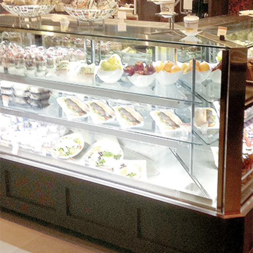 Monarch Dual Display Case, full service, 72"W, self-contained refrigeration, right-hand mitered end, tempered glass front, mirrored rear sliding doors, (2) tempered glass shelves, LED lighting, self-evaporating condensing unit, white laminated deck, mirrored interior ends, laminate exterior finish, 1/2 HP, 115v/60/1-ph, 13.9 amps, cord, NEMA 5-20P, cETLus, ETL-Sanitation (unit designed to be paired with another Monarch Dual or Monarch Dual Over/Under for corner display)