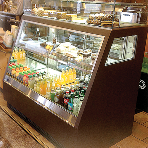 Manhattan II Display Case, 48"W, self-contained refrigeration with ambient top, full service top, grab & go bottom, (1) tempered glass shelf (top & mid), rear sliding doors, electronic control with digital display, defrost termination, LED lighting, removable deck pan, stainless steel interior ends, laminate exterior finish, 1/2 HP, cETLus, ETL-Sanitation (Floor drain required)