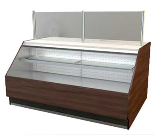 Stratus Air Screen Display/Work Station, 72" W, self-contained front display case with stainless steel deck, (1) glass shelf with LED light; top canopy LED light; rear work area with ZipLite cutting board, (3) wet/dry hot food wells with manifold drains, open shelf cabinet base, 18" H glass protector guard with stainless steel post, laminated exterior, floor drain required, 3/4 hp, cETLus, ETL-Sanitation, NSF