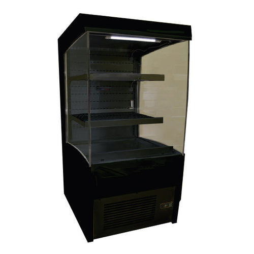 Refcon™ SWIN Mini Air Screen Open Merchandiser, 24"W, bottom mount self-contained refrigeration, squared top canopy, (2) adjustable shelves, LED top canopy light, side vision end panels, removable hemmed deck pan, digital temperature display, condensate evaporator system, thermometer, black interior & exterior, 1/2 HP, 115v/60/1-ph, 12.8 amps, cord, NEMA 5-20P, cETLus, ETL-Sanitation