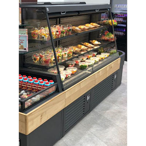 Vienna Caleo Cold Display, 23-5/8"W, freestanding, low profile, self-contained refrigeration, slanted profile with insulated glass ends, (2) tempered glass shelves, programmable digital controller, LED lighting, front air dam glass, removable deck pans, air cooled system with variable speed fan, lift up evaporator, manual pull down night curtain, hot gas evaporation system, stainless steel interior & exterior, adjustable feet & casters, 1/2 HP, cETLus, ETL-Sanitation