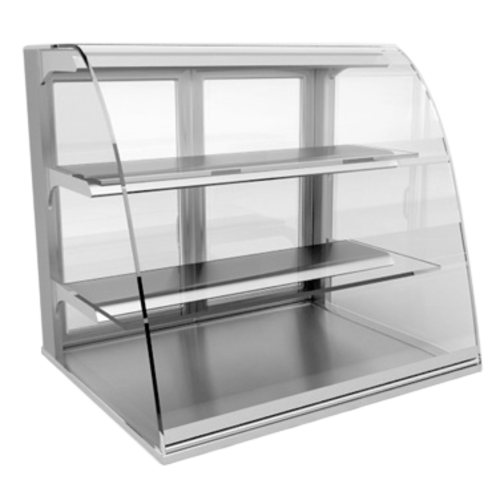 Vienna Dry Countertop Display, 31-1/2" W, full service, tempered tilt-open curved front glass, removable tempered side glass panels, top canopy LED light, (2) adjustable tempered glass shelves with LED light, stainless steel exterior, hinged rear see-thru access doors, cETLus, ETL-Sanitation, NSF