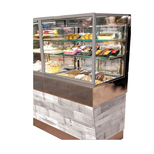 Vienna Pro Style Ambient Display, 31-3/8" L, squared glass profile, insulated glass with grey trim, closed front for service case, top canopy LED light, (2) adjustable glass shelves with LED lights, hinged rear see-through doors, #4 stainless interior & exterior finish, PRO style base finished, adjustable levelers, cETLus, ETL-Sanitation, NSF