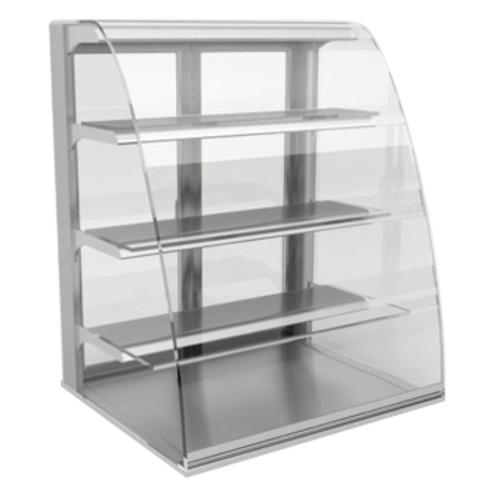 Vienna Dry Countertop Display, 31-1/2" W, full service, tempered tilt-open curved front glass, removable tempered side glass panels, top canopy LED light, (3) adjustable tempered glass shelves with LED light, stainless steel exterior, hinged rear see-thru access doors, cETLus, ETL-Sanitation, NSF
