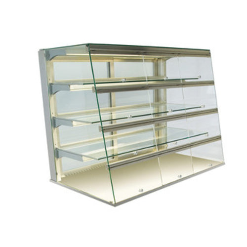 Vienna Dry Countertop Display, 44-1/4"W, self-service, tempered slanted glass profile with front flip-up doors, (3) adjustable shelves, LED lights, hinged see-through rear access doors, stainless steel interior & exterior, cETLus, ETL-Sanitation, NSF