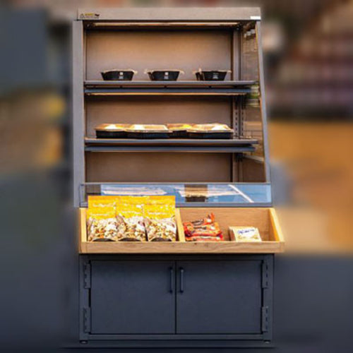 Vienna Caleo Hot Display, 47-1/4"W, freestanding, low profile, grab & go, slanted profile, insulated glass ends, (2) black glass shelves + fixed black glass deck with heating plates, infrared heating lamps, variable temperature control, heat-resistant LED lighting, stainless steel interior & exterior, adjustable feet & casters, cETLus, ETL-Sanitation