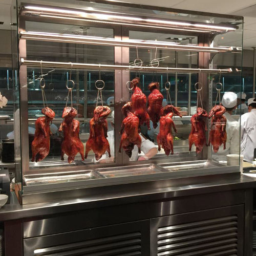 Vienna Heated Duck & Meat display Case, 57-3/4" L, countertop, full service, tempered squared glass profile, hinged rear doors, LED top canopy, infrared heat lamp, (2) meat hanging rails, (3) stainless steel drip pans, rear mounted temperature controls, stainless steel exterior, (4) mounting plates for securing on counter, 208-240V, 9.8 amps, cord & L14-20P plug, cETLus, ETL-Sanitation