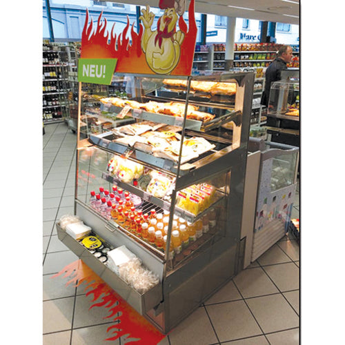 Vienna Vertical Hot/Cold Combo Self Service Display Case, 31-1/2"W, self-contained refrigeration with front air breathing, programmable digital controller, slanted profile, glass top & sides, top section with (2) heated black glass shelves, lower section with (1) refrigerated shelf & deck, LED lighting, rear interior mirrored, stainless steel interior & exterior, cord with NEMA L14-20P, cETLus, ETL-Sanitation, NSF