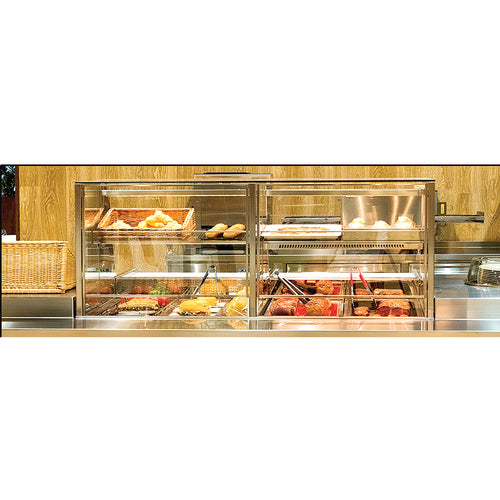 Vienna Vertical Side By Side Hot/Cold Combo Display Case, 59-1/2" W, self-contained refrigeration with rear air ventilation kit, programmable digital controller, squared glass profile, insulated glass sides & divider glass, tempered glass top & lift-up front glass, (1) shelf in each section, service side open, cold/hot pans in rear with retractable cutting board, variable fan speed, canopy & shelf light, stainless steel interior & exterior, R134a, cord, NEMA L14-20P, cETLus, ETL-Sanitation, NSF