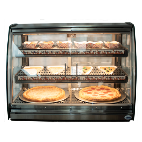 Combo Serve Hot Food Display Case, countertop, full/self-service, 35.3"W x 19.7"D x 27.6"H, curved side glass, 3-tier, 2-adjustable shelves, two hinged front swing open glass doors with center pull door handles, two rear sliding doors, rear-mount controller (w/front on/off button), (6) independent ajustable heating zones (100° - 265°F), (12) programmable timers, (2) low volume circulation fans, Xenon interior lighting, stainless steel finish, includes: (6) removable wire racks, cULus, NSF