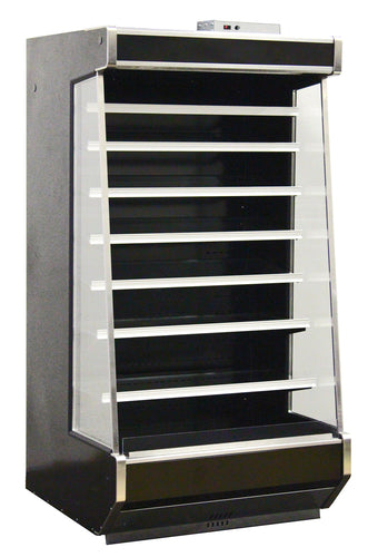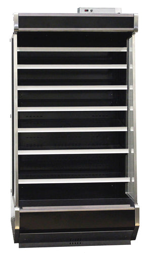 Open Air Merchandiser, joinable, designed for remote refrigeration, 37.9"W x 36.1"D x 75.6"H, 20.73 cu. ft. capacity, Tier II NSF, Joinable, Low deck, ECM fan motors, automatic & timer defrost cycles, (7) adjustable glass shelves, LED interior lighting, digital controls, monitoring capabilities, black interior, black powder coated steel exterior finish, (4) 2" casters, NSF, cETLus, ETL-Sanitation
