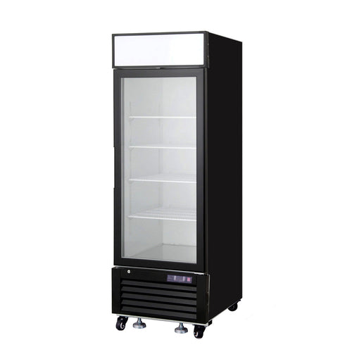 Reach-In Refrigerated Merchandiser, one-section, self-contained, 24.2" W, 10 cu. ft. capacity, (1) triple paned self-closing hinged glass door, (4) shelves, digital display/controls, LED interior lighting, illuminated canopy, black exterior, aluminum interior with stainless steel floor, (4) 3" casters with leveling feet, bottom mount refrigeration, R290a refrigerant, 1/6 HP, 115v/60/1-ph, 3.2 amps, cETLus, ETL-Sanitation