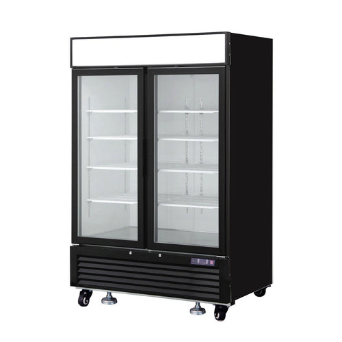 Reach-In Freezer Merchandiser, two-section, 54.4" W, 45 cu. ft. capacity, self-contained bottom mount refrigeration, (2) triple paned self-closing hinged glass doors, (8) shelves, digital display/controls, LED interior lighting, illuminated canopy, black exterior, aluminum interior with stainless steel floor, (4) 3" casters with leveling feet, R290a refrigerant, 3/4 HP, 115v/60/1-ph, 8.6 amps, cETLus, ETL-Sanitation