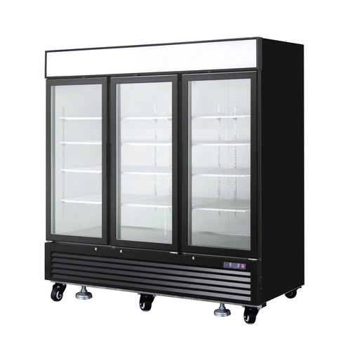 Reach-In Refrigerated Merchandiser, three-section, 81.9" W, 72 cu. ft. capacity, self-contained bottom mount refrigeration, (3) triple paned self-closing hinged glass doors, (12) shelves, digital display/controls, LED interior lighting, illuminated canopy, black exterior, aluminum interior with stainless steel floor, (4) 3" casters with leveling feet, R290a refrigerant, 1/3 HP, 115v/60/1-ph, 4.2 amps, cETLus, ETL-Sanitation